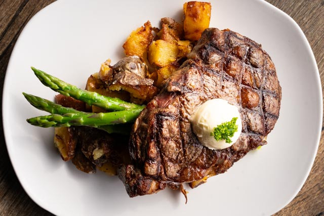 메뉴를 살펴보던 나는 추천을 받아 13온스 립아이 스테이크인 'Cowboy Steak'을 주문했습니다. USDA PRIME 등급의 Brandt Beef를 사용한 이 요리는, 겉은 바삭하고 속은 촉촉한 완벽한 굽기로 제공됩니다. 스테이크 위에는 버터가 살짝 녹아 풍미를 더했고, 곁들여진 감자와 아스파라거스는 보기에도 좋고 맛까지 훌륭했습니다. 칼을 대자 부드럽게 잘리는 고기 단면에서 육즙이 흘러나왔고, 은은한 불향이 입안 가득 퍼졌습니다. 감자는 노릇하게 구워져 바삭했고, 아스파라거스는 신선한 식감을 더했습니다. 아이스티 한 모금은 이 모든 맛의 조화를 깔끔하게 정리해 주었습니다.